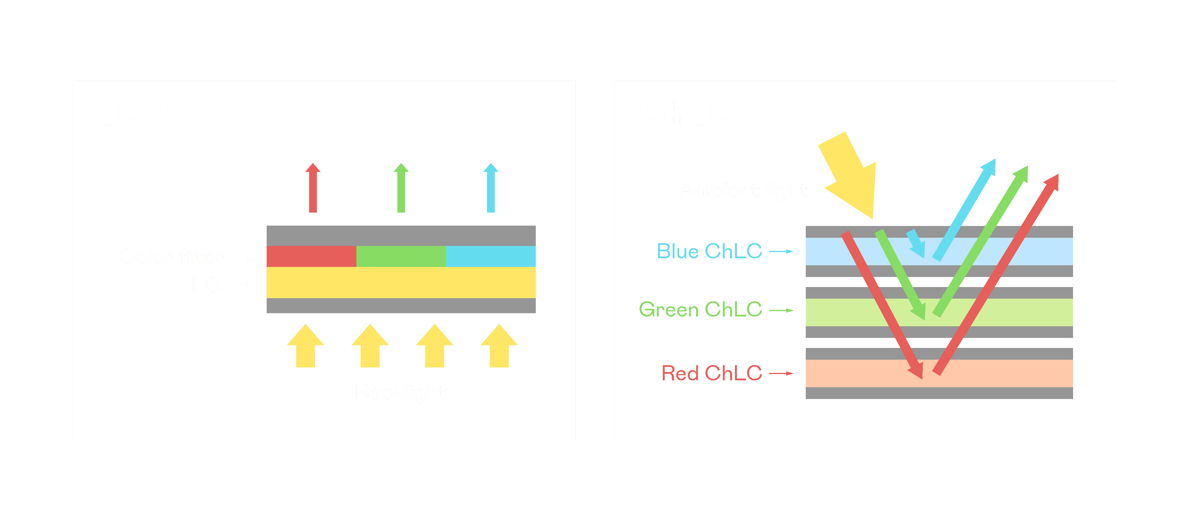 ChLCD 胆固醇液晶就如同纸张一样,,,透过反射环境光来显示影像,,,,因此长时间观看不易造成人眼视觉疲劳,,,,可达到护眼效果。。当处于户外阳光下使用,,,LCD 影像容易失真而不易观看,,,但胆固醇液晶仍可维持较佳的影像品质。。。