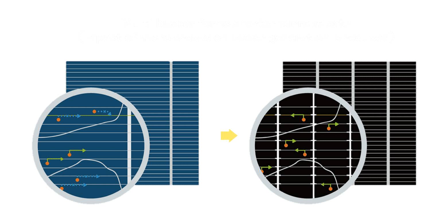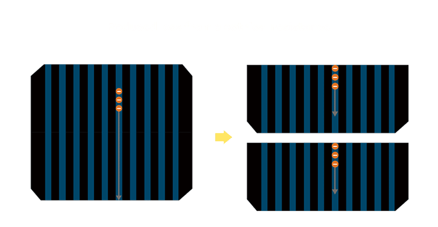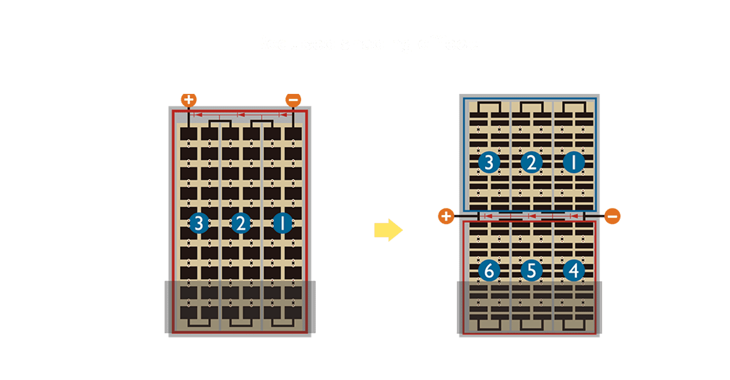 • 结合半切电池,,降低遮阴影响、、提升模组抗隐裂能力、、并减少电阻损耗,,,进一步提升模组发电效能。。