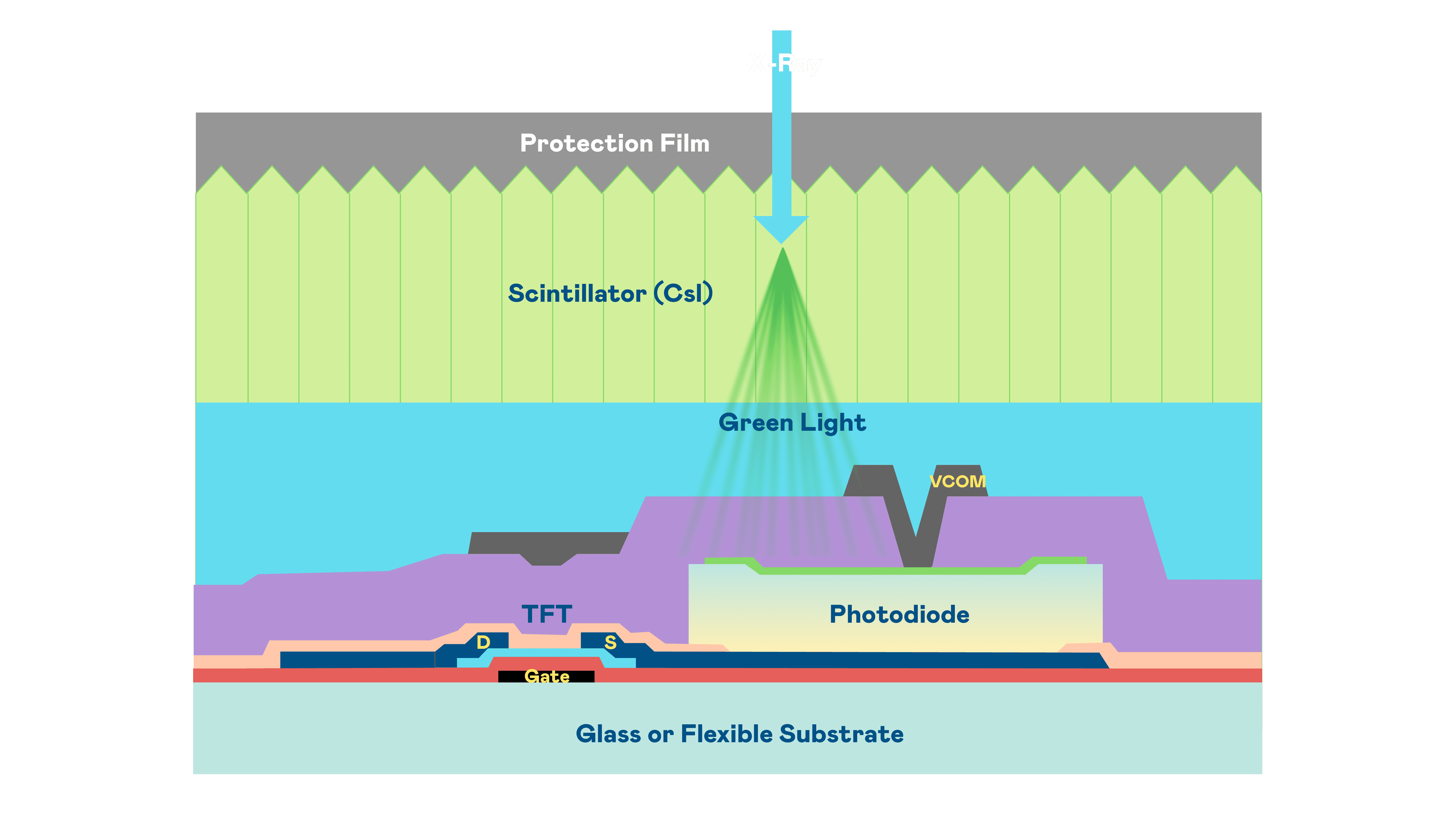 云顶国际8588yd的X光影像感测阵列使用薄膜电晶体 (TFT) 作为每个像素的读取开关,,,,搭配光电二极体(Photodiode)的光电转换元件,,,用以感测X光影像讯号。。。。